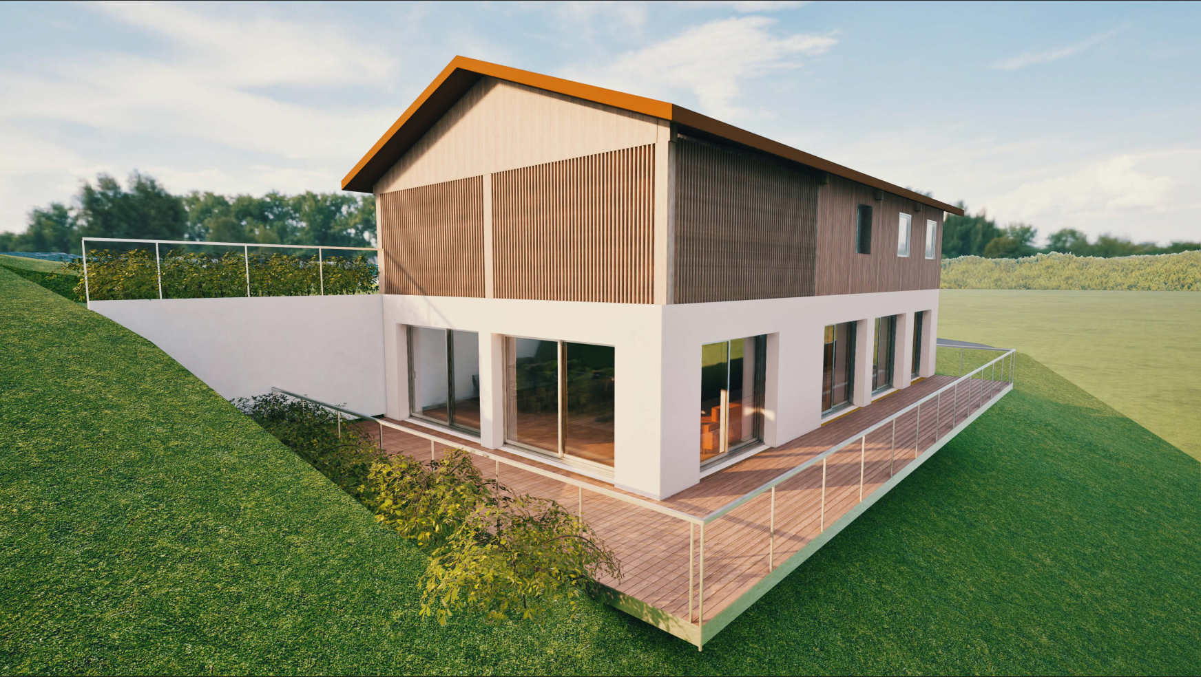 Vous trouverez ci-dessous une projection 3D photoréaliste de l'intérieur et de l'extérieure de la maison faite par notre bureau d'architecture.